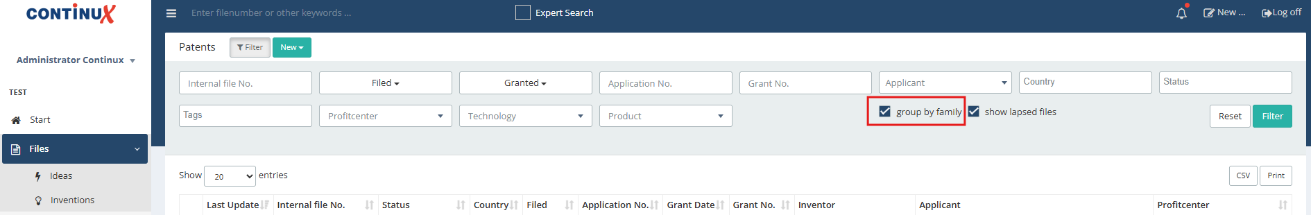 | Grouped file view – step by step 1. Open the desired file list (e.g. Files → Patents). 2. Select or clear the “group by family” checkbox. 3. Click “Filter”. 4. Result: Either one entry per family is displayed or all files in the family. |