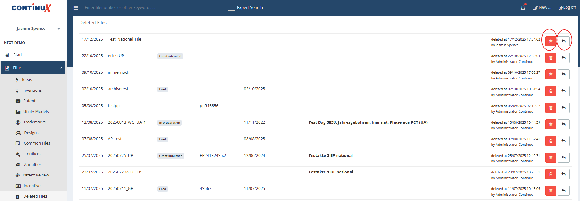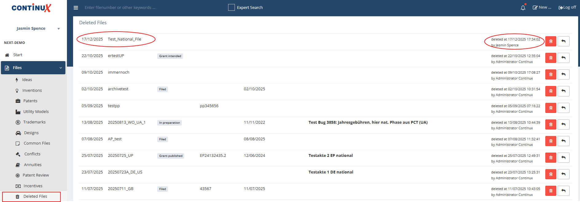 Open “Deleted files” 1. Menu path: Files → Deleted files. 2. The most recently deleted file appears at the top of the list. 3. The list also shows the deletion date, time and the user who deleted the file. |
