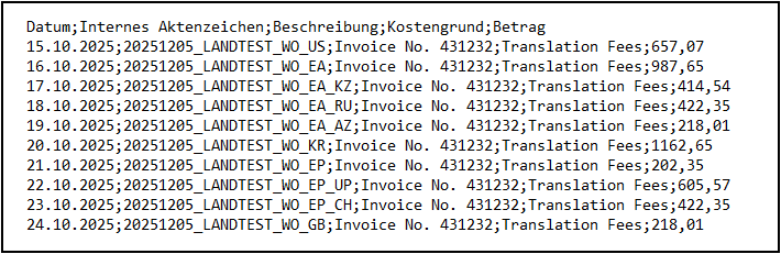 Hinweis: Die in der Excel-Spalte „Kostengrund“ verwendeten Werte (z. B. „Translation Fees“) müssen in Continux bereits angelegt sein. Nur dann kann Continux den Kostengrund beim Upload automatisch zuordnen.