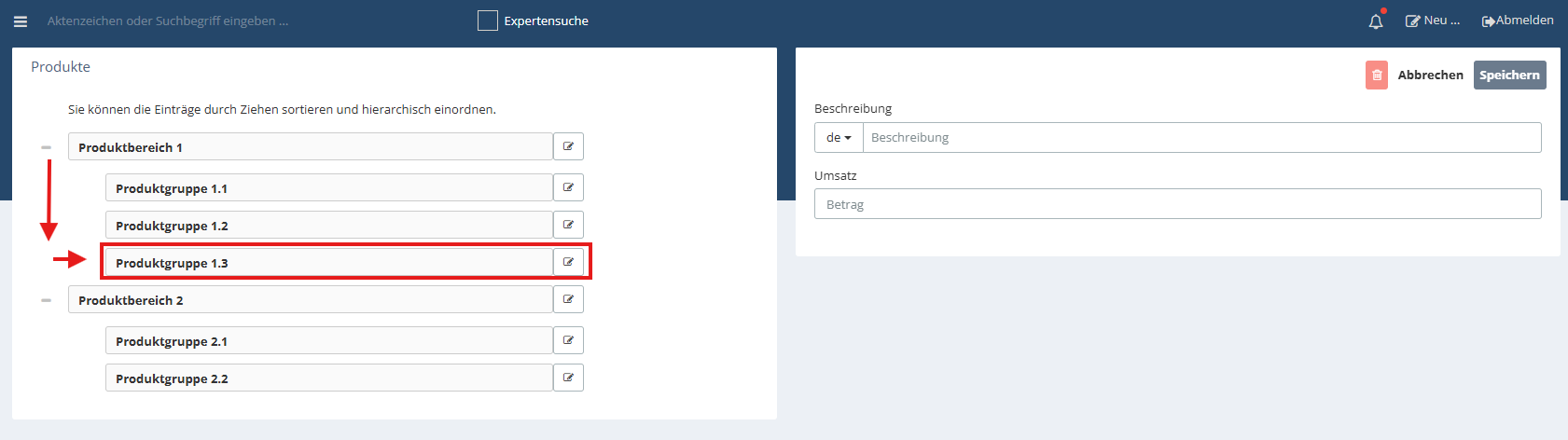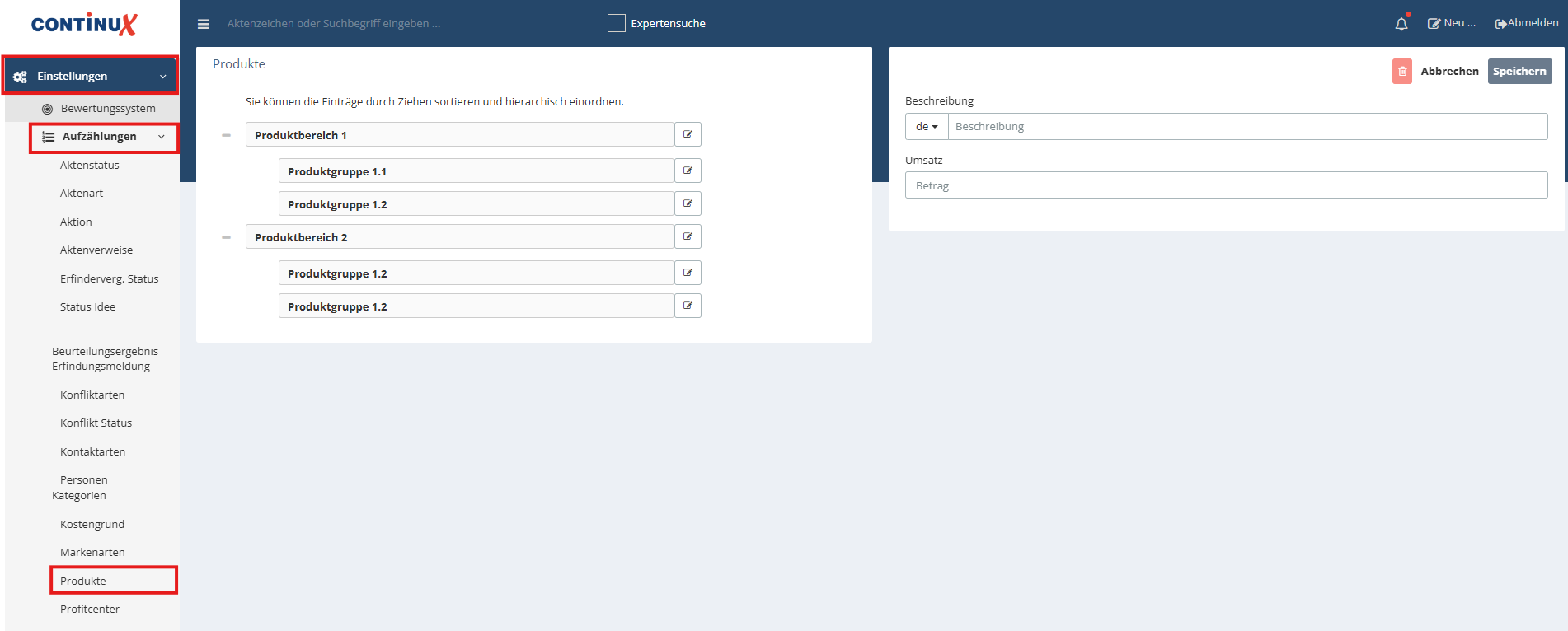 | In Continux lassen sich Produkte zentral über das Menü „Einstellungen“ und den Unterpunkt „Aufzählungen“ verwalten. Vorhandene Einträge können bearbeitet, neue angelegt und bestehende sowie neue Einträge per Drag-and-Drop verschoben und organisiert werden. Durch Auswahl des Bearbeitungssymbols wird der jeweilige Produktname geändert. Mit „Speichern“ werden die Änderungen übernommen. | |