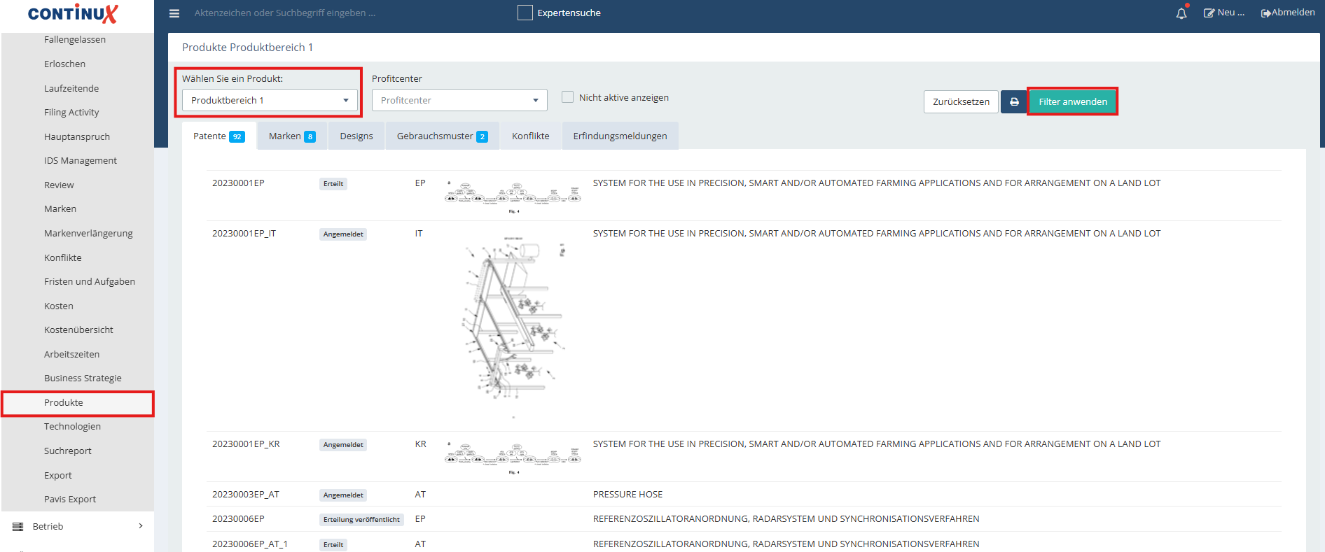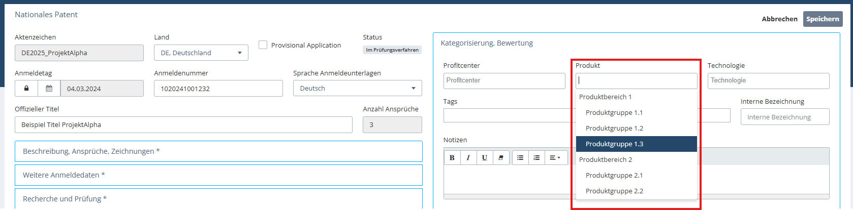| Anwendung und Auswahl des neuen Produkts in einem Bereich Die Änderungen sind nach dem Speichern sofort wirksam und stehen in allen relevanten Bereichen von Continux verfügbar. Beispiel: Auswahl des neuen Produkts in der Aktenmaske nationales Patent | |