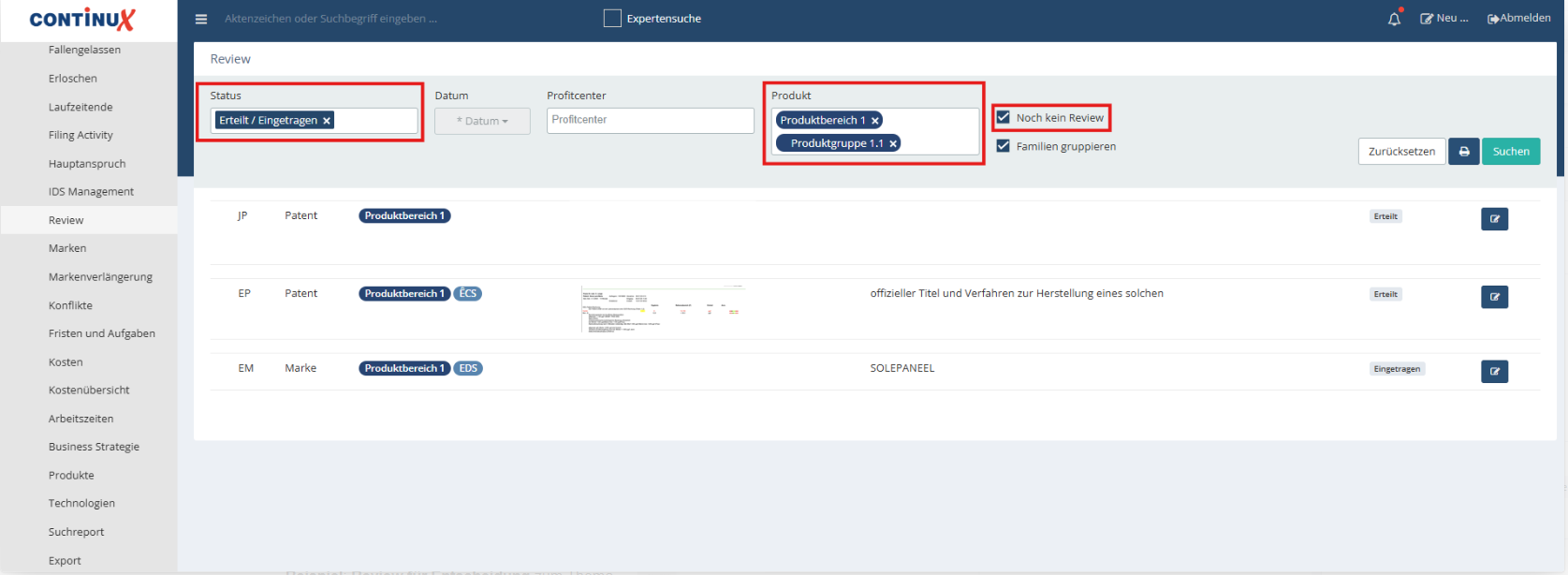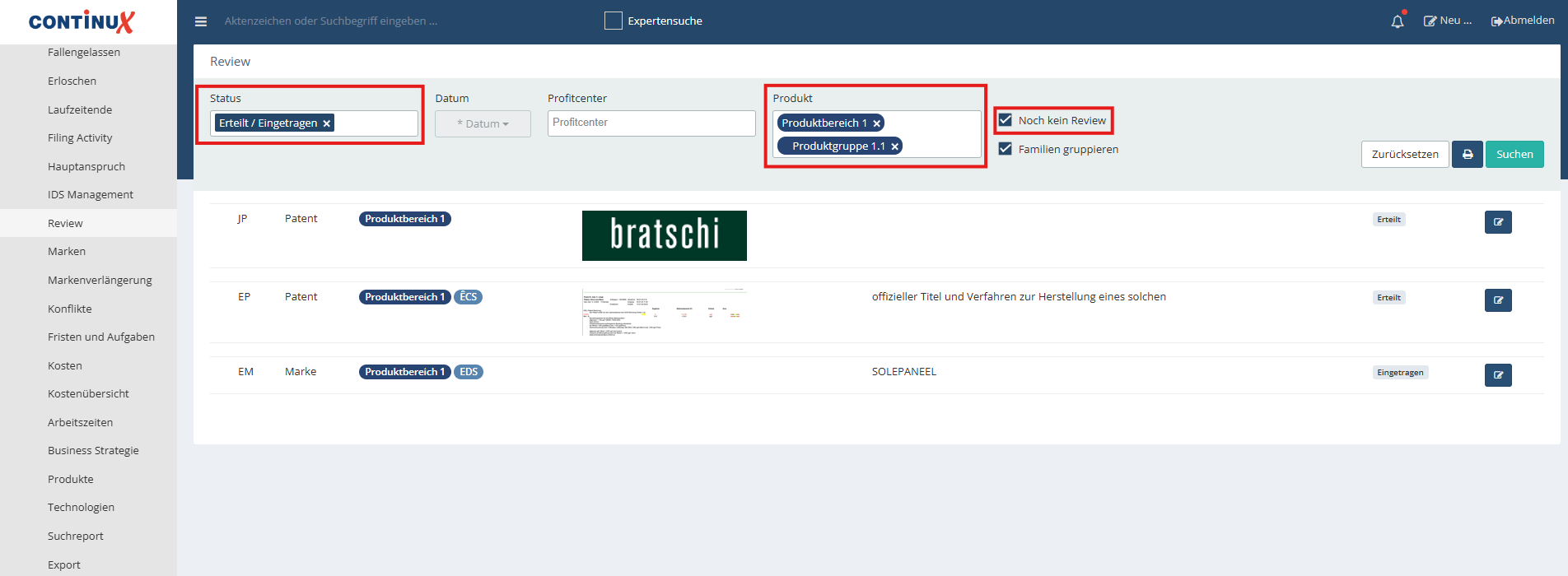 | Review Report: Über Menü > Reports > Review können Reviews nach einem oder mehreren Produkten sowie einem Zeitraum (z. B. für ein bestimmtes Jahr) gefiltert werden. Durch Häkchen Abfrage weiter filtern, ob Review stattgefunden hat und/oder nicht. Beispiel: Review für Entscheidung zum Thema noch zu besprechende eingetragene / erteilte Schutzrechte: aufrechterhalten oder fallenlassen > so erscheinen passende Akten entsprechend dem Screenshot-Beispiel und können für den nächsten internen Review-Termin mit aufgenommen werden. | ![]() |