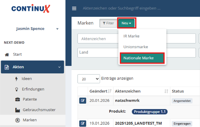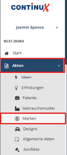 Das Anlegen einer nationalen Marke erfolgt nach dem gleichen Grundprinzip wie im Artikel „Anlage einer neuen Akte in Continux“ beschrieben. Dieser Artikel ergänzt die allgemeinen Schritte um die Besonderheiten, die für eine nationale Markenakte relevant sind. Neue Akte „Nationale Marke“ anlegen 1. Im linken Hauptmenü den Bereich „Akten“ → „Marken“ auswählen. | |