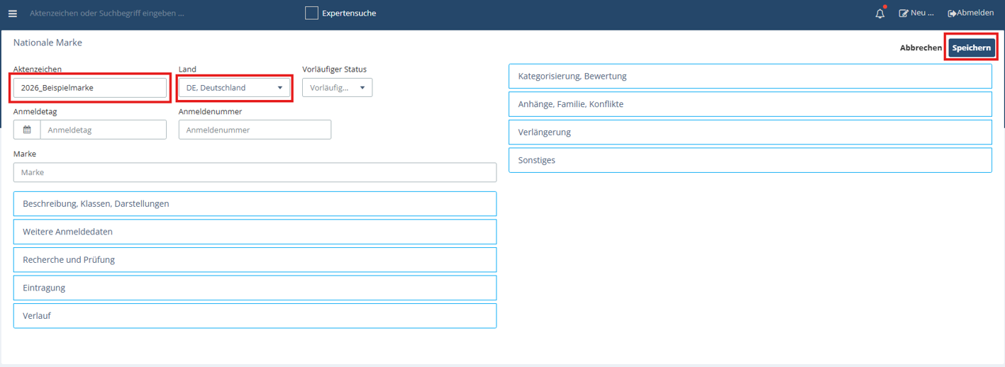 Weitere Felder der nationalen Marke Die Felder sind entsprechend dem Ablauf eines Markenverfahrens angeordnet – von Anmeldung (Anmeldetag, Anmeldenummer, Markenbezeichnung) über Waren- und Dienstleistungsverzeichnis, Recherche und Prüfung bis zur Eintragung, Verlängerung und laufenden Verwaltung der Marke. Bei der Erstanlage genügt es, die Pflichtfelder auszufüllen; weitere Angaben wie Eintragungsdaten oder Widersprüche können zu einem späteren Zeitpunkt ergänzt werden. | |