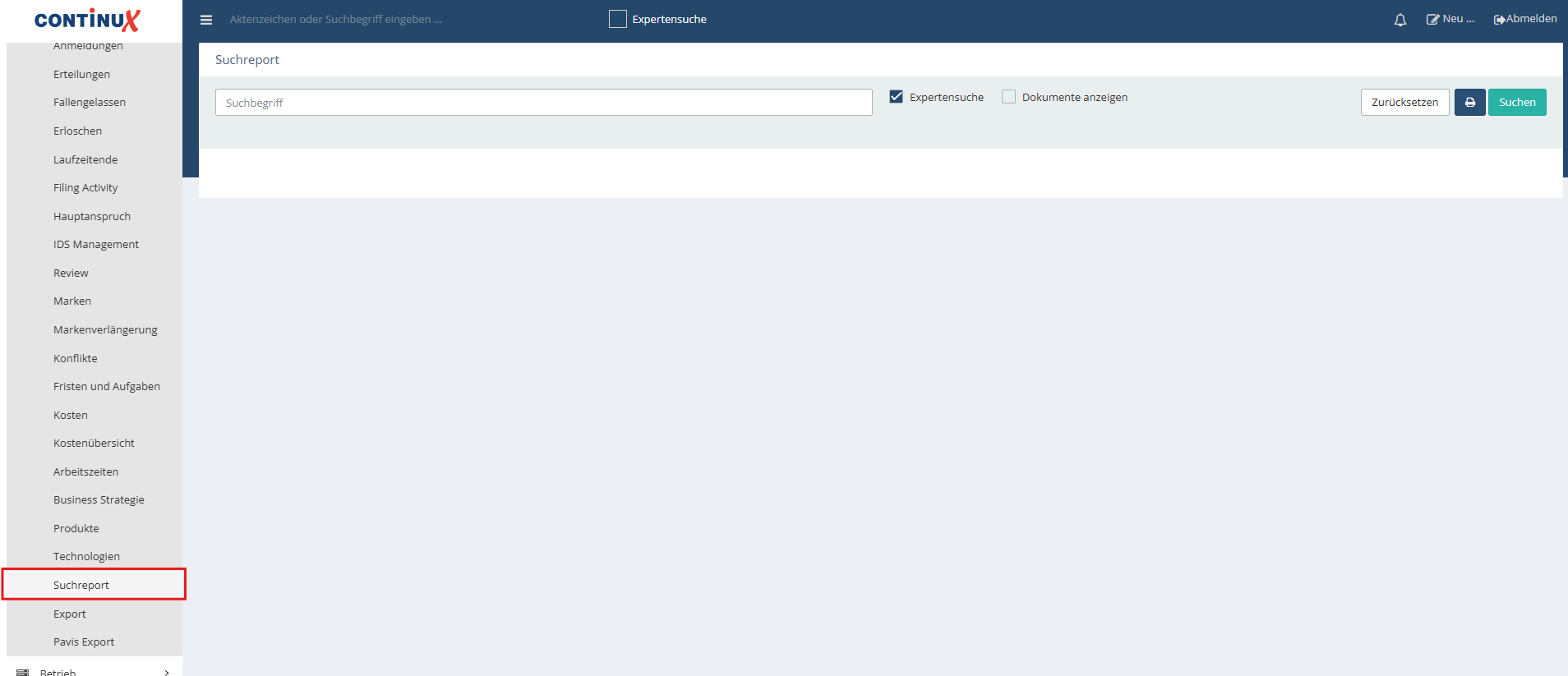 | Der Suchreport ist ein universelles Suchwerkzeug in Continux. Hier können Sie Akten, Inhalte und Dokumente gezielt durchsuchen - unabhängig von der Aktenart. | |