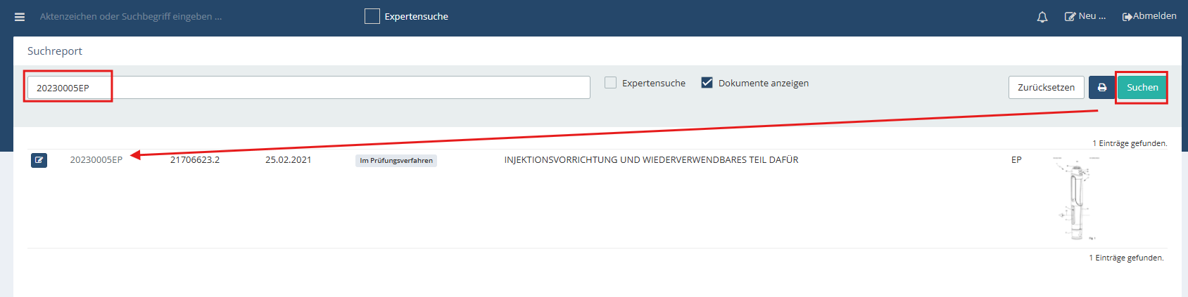 | In beiden Abfragen wird dieselbe Akte angezeigt, da sowohl das Aktenzeichen als auch der Begriff „Vorrichtung“ in ihren Inhalten vorkommen. | |