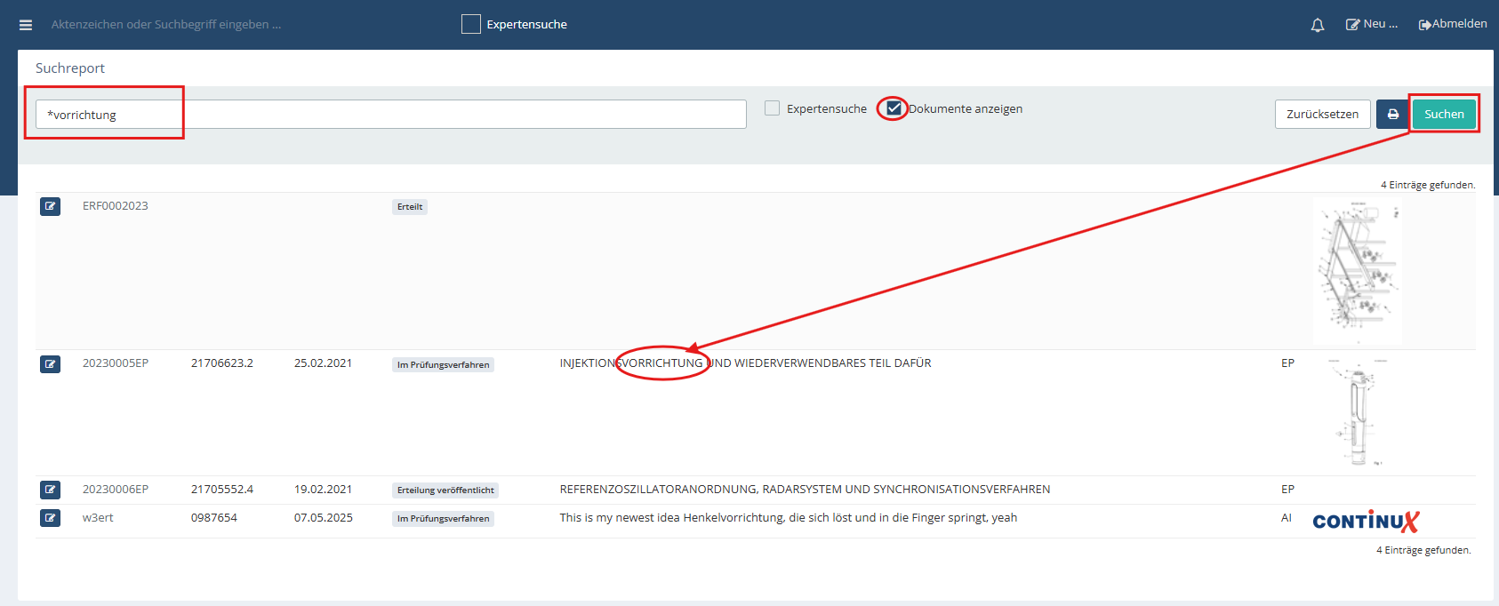 | In das Feld Suchbegriff geben Sie den gewünschten Ausdruck ein. Continux gibt alle Treffer aus, in denen der Begriff vorkommt: | |