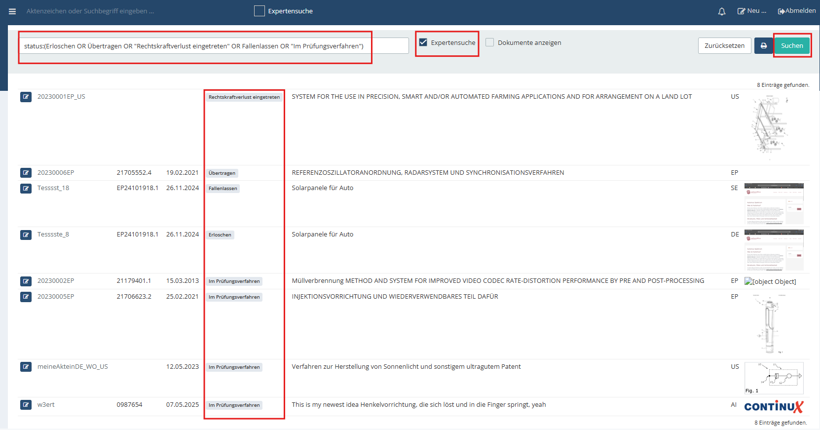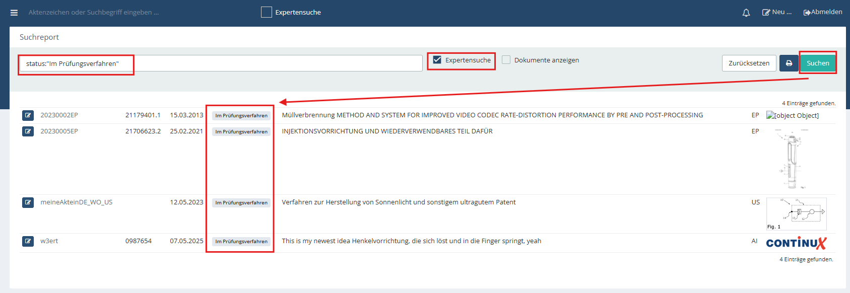 | Wir suchen nach einem bestimmten Status status:"Im Prüfungsverfahren" und erhalten: |  |
