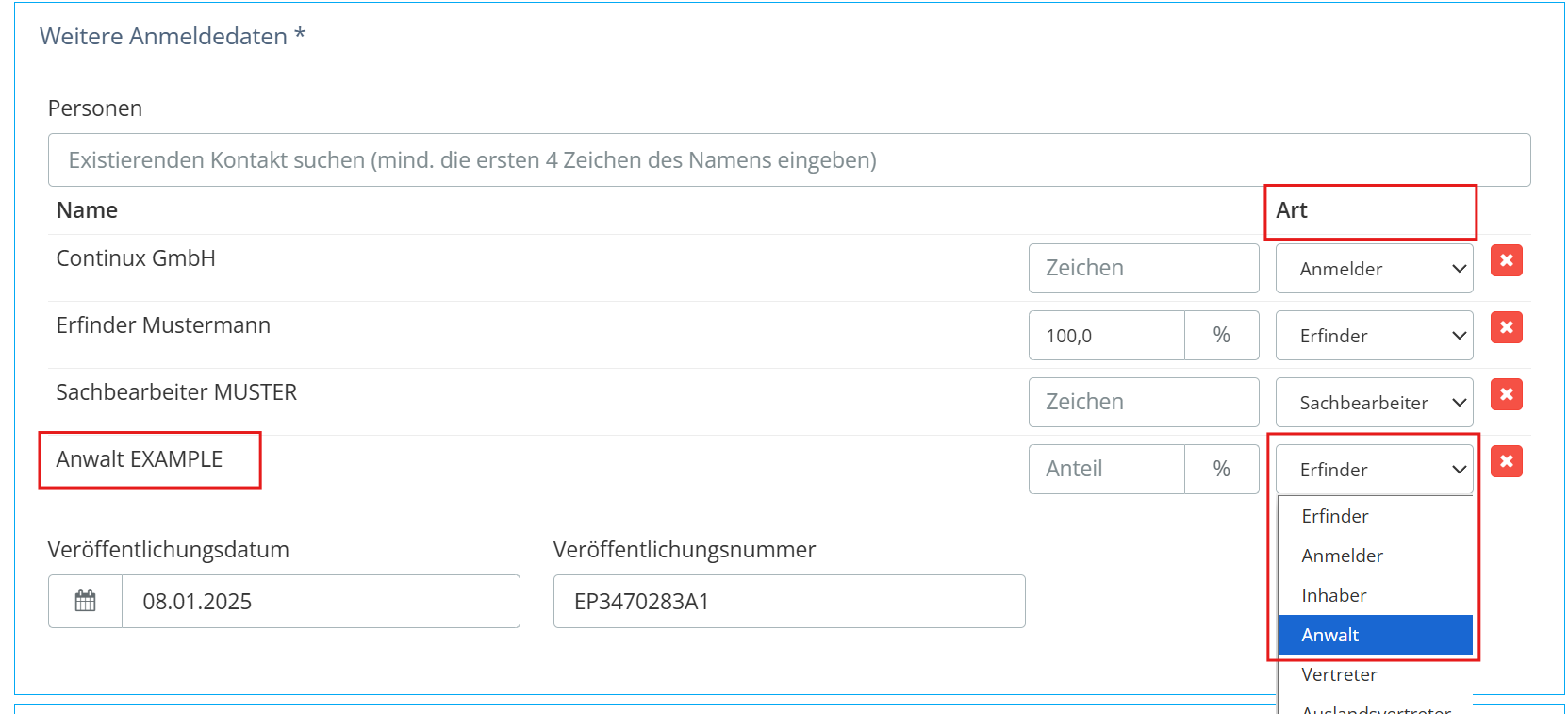 | 4. Wählen Sie in der Spalte Art die gewünschte Funktion aus, z. B. Anwalt oder Sachbearbeiter |