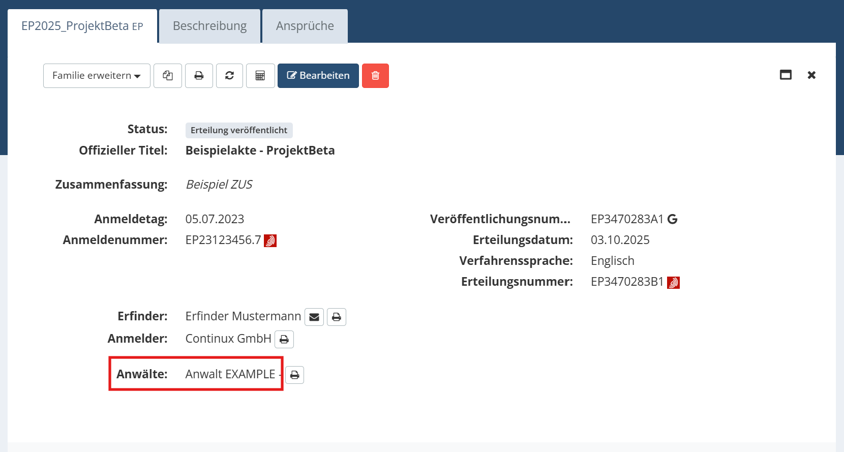 | Tipp: Sie können einer Akte auch mehrere Anwälten zuweisen, dann erscheinen alle zugewiesenen Anwälten in der Aktenübersicht. Grundsätzliches Wer ist in der Aktenübersicht sichtbar? - Anmelder, Erfinder, Anwälte und Vertreter. Wen sehen Sie dort nicht? - Sachbearbeiter |