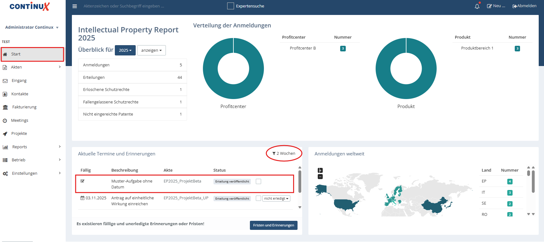 | Vorgehen 1. Klicken Sie auf die Startseite 2. Setzen Sie in diesem Fenster den Filter für den Zeitraum [Beispiel: 2 Wochen] |