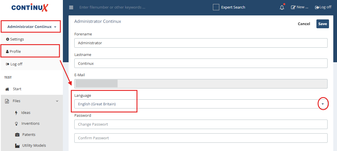 | Continux supports multiple languages. The preferred language can be set or changed in the profile at any time. To set the preferred language: |