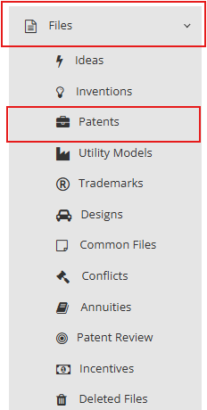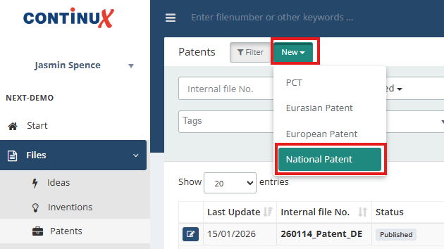 To create a national patent file, follow the same basic steps as described in the article “Creating a new file in Continux”. This article adds the specific input fields that are relevant for national patent files. Create a new “National patent” file 1. In the main menu on the left, go to “Files” → “Patents”. | |
