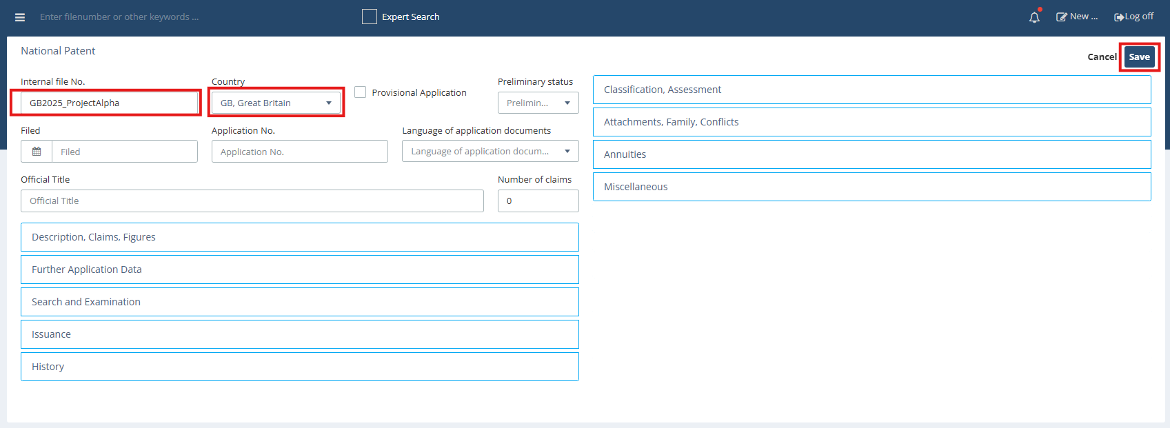 4. The “National Patent” entry form opens. 7. Click “Save” to create the new file. | |