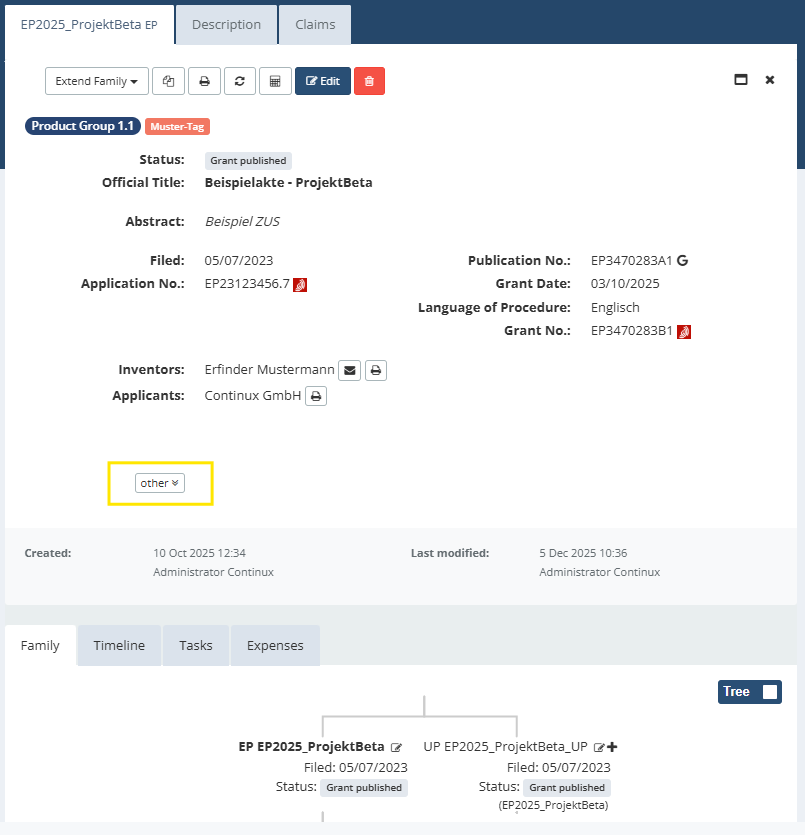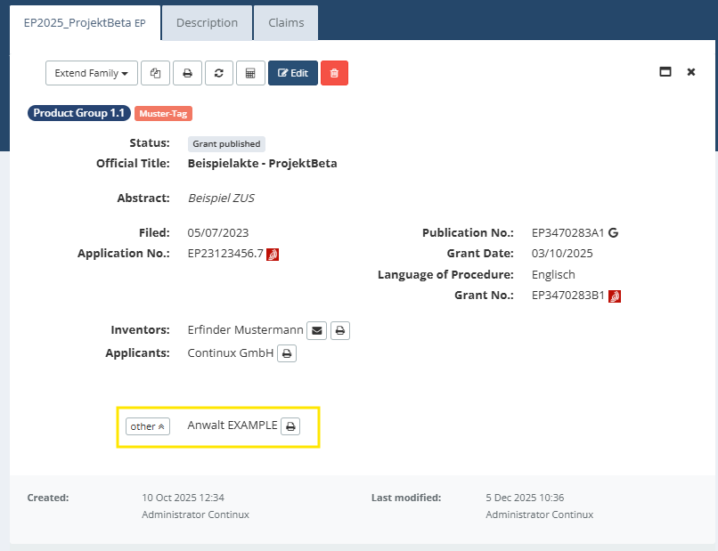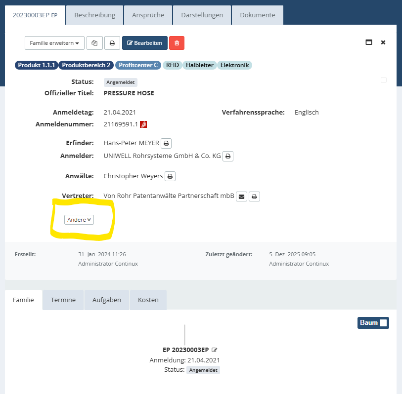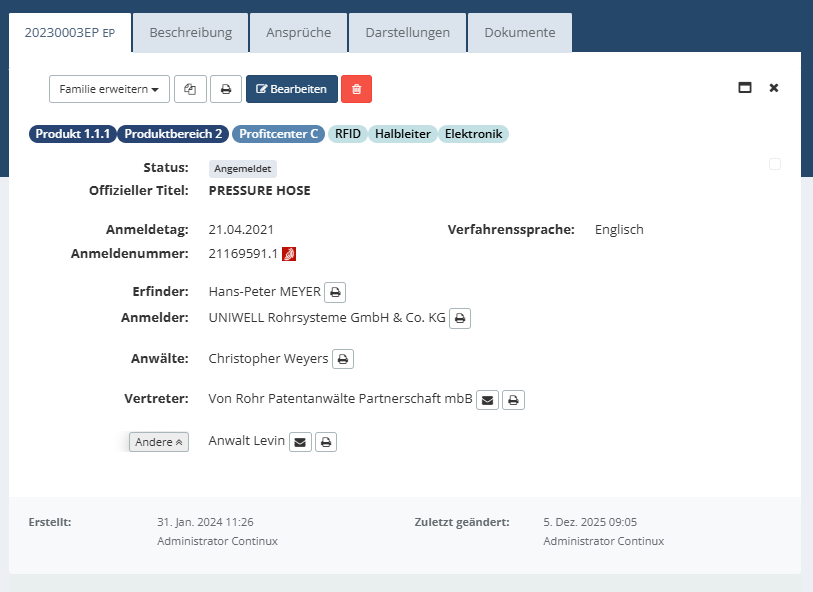 We have expanded the global roles as you know them. In addition to the bibliographic roles (applicant, inventor, representative, etc.), many new roles have now been added. To preserve the battle-critical clarity that is so important in Continux, we kept the essential roles in their usual place. Here is an image for illustration: