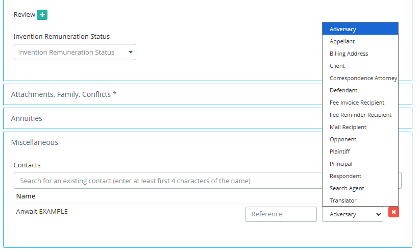 We have placed the additional roles in a new section. The new section is called “Miscellaneous”. There, you can now add and save contacts with other roles. Below is a summary of all roles: