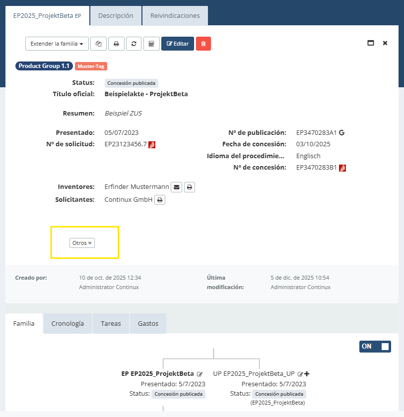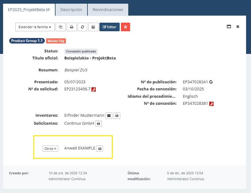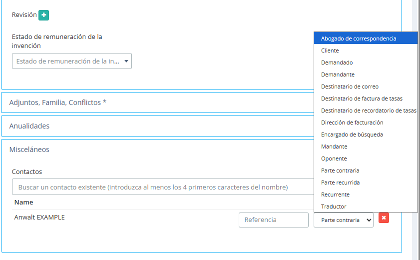 Se pueden definir personas de contacto dentro de un expediente (empresa y personas físicas), también más allá de inventor, solicitante, etc. (roles codificados).