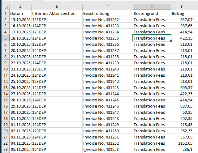 12.08.2025;"124DEP";"Invoice No. 431232";"Translation Feess";422,35