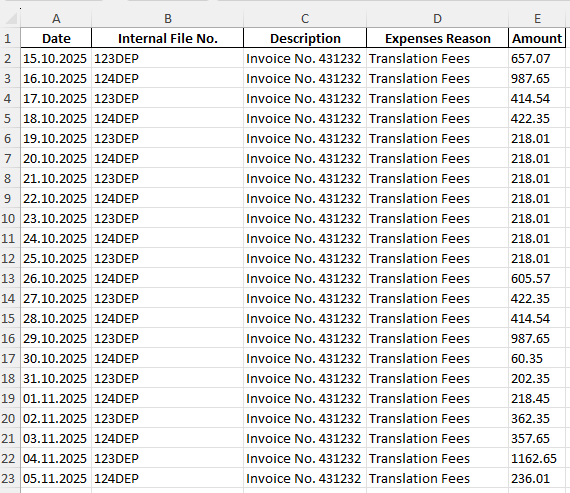 12.08.2025;"123DEP";"Invoice No. 431232";"Translation Feess";657,07