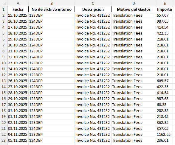 12.08.2025;"124DEP";"Invoice No. 431232";"Translation Feess";987,65