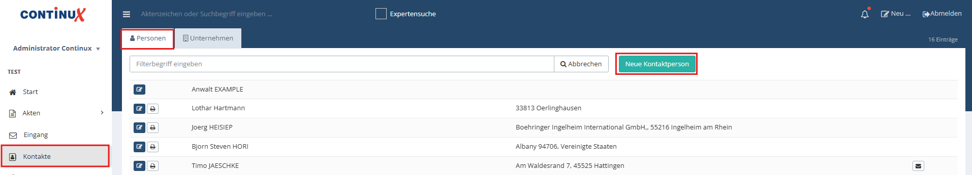 | Praxistipp zur Vermeidung einer Anlage von Doppelkontakten: vor der Erfassung einer neuen Person, die Filterleiste nutzen, um bestehende Personen zu durchsuchen. |