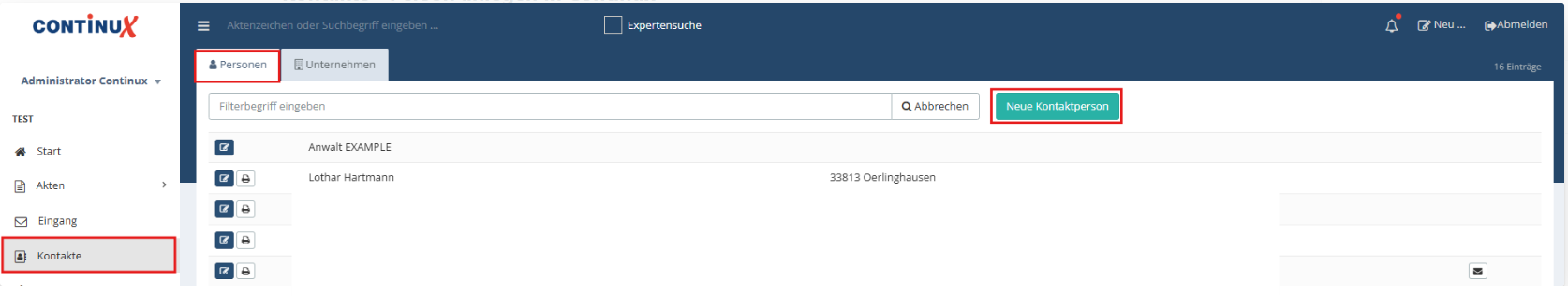 1. Kontakte im Hauptmenü aufrufen und Reiter „Personen“ wählen. 2. grüner Button „Neue Kontaktperson“ anklicken. |