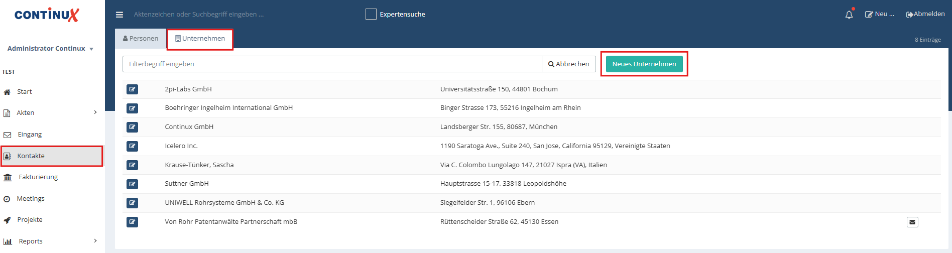 | Unternehmen werden als Kontakte geführt und z. B. als Inhaber, Anmelder oder Auftraggeber in Akten verwendet. Voraussetzung ist, dass das Unternehmen einmalig in den Kontakten angelegt ist. |