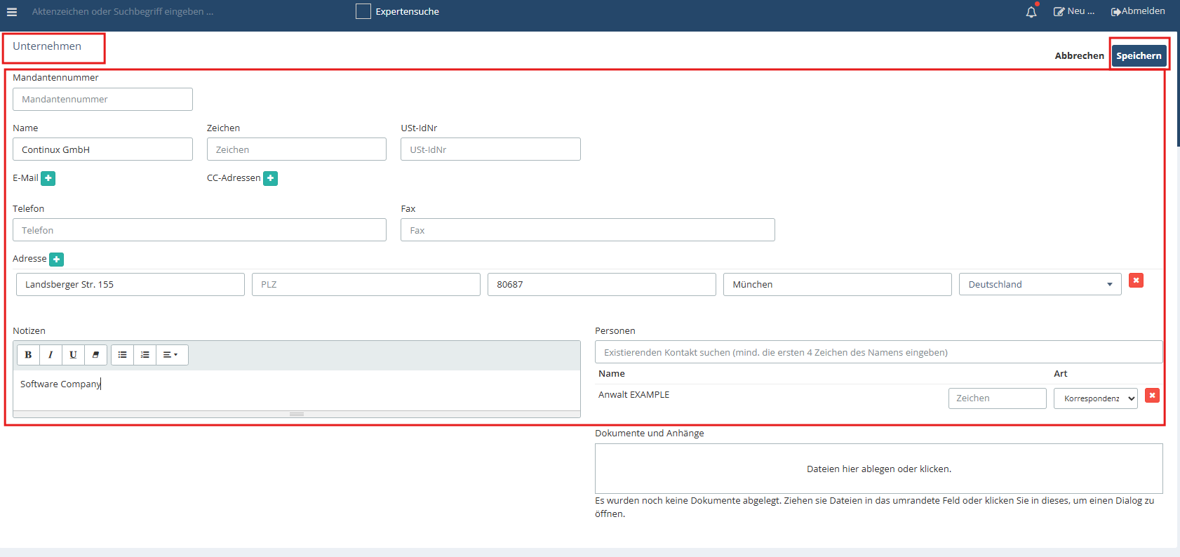 | 3. Eingabemaske Unternehmen öffnet sich. 4. Relevante Daten in die Felder eintragen. 5. (optional) Person aus Continux (bereits angelegte) mit Unternehmen verknüpfen. 6. Hinweise im Notizfeld eintragen (optional) 7. Vorgang mit „Speichern“ abschließen. |