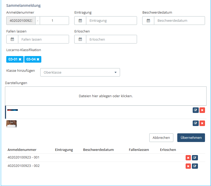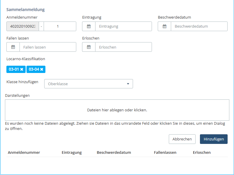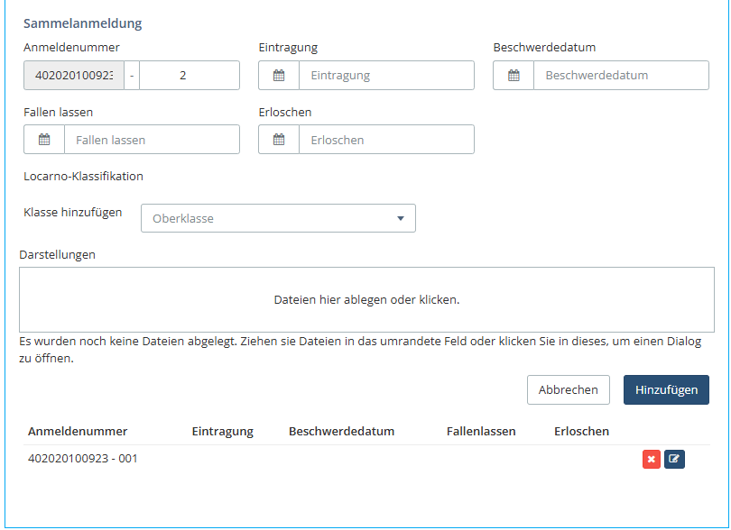 Beim Hinzufügen von Sammeldesigns, was Sie im Bereich "Sammelanmeldung" in Ihrer Designmaske vornehmen, übernimmt Continux die Anmeldenummer der Designanmeldung automatisch. Im abgeteilten rechten Teil der Anmeldenummer wie in der obigen Grafik dargestellt kann eine fortlaufende Nummer als Ergänzung zur Anmeldenummer eingegeben werden. Nach HInzufügen der Locarno-Klassifikation und des Einfügens der Darstellung des Designs (des Musters) oder Einfügen mehrerer Muster gehen Sie auf "Hinzufügen".