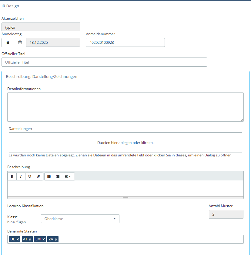 Abbildung 5: Automatisch nach Eingabe des Eintragungsdatum werden die benannten Staaten des IR-Designs in Continux als Akte angelegt!