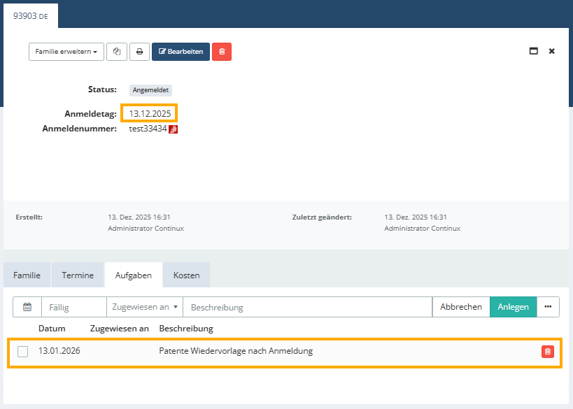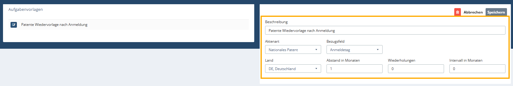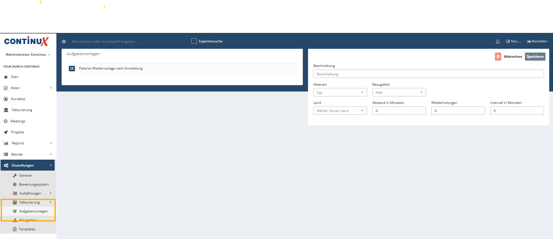 Der vielfache Wunsch unserer Kundinnen und Kunden wurde nun erhört und wird mit diesem Release Realität! Sie können ab sofort in Continux wiederkehrende Aufgaben als Vorlage definieren. Beispielsweise können Sie hinterlegen, dass Continux zum Beispiel auf den Anmeldetag eines deutschen Patentes immer eine Wiedervorlage von einem Monat als Aufgabe automatisch anlegen soll (sobald der Anmeldetag eingegeben und gespeichert wird).