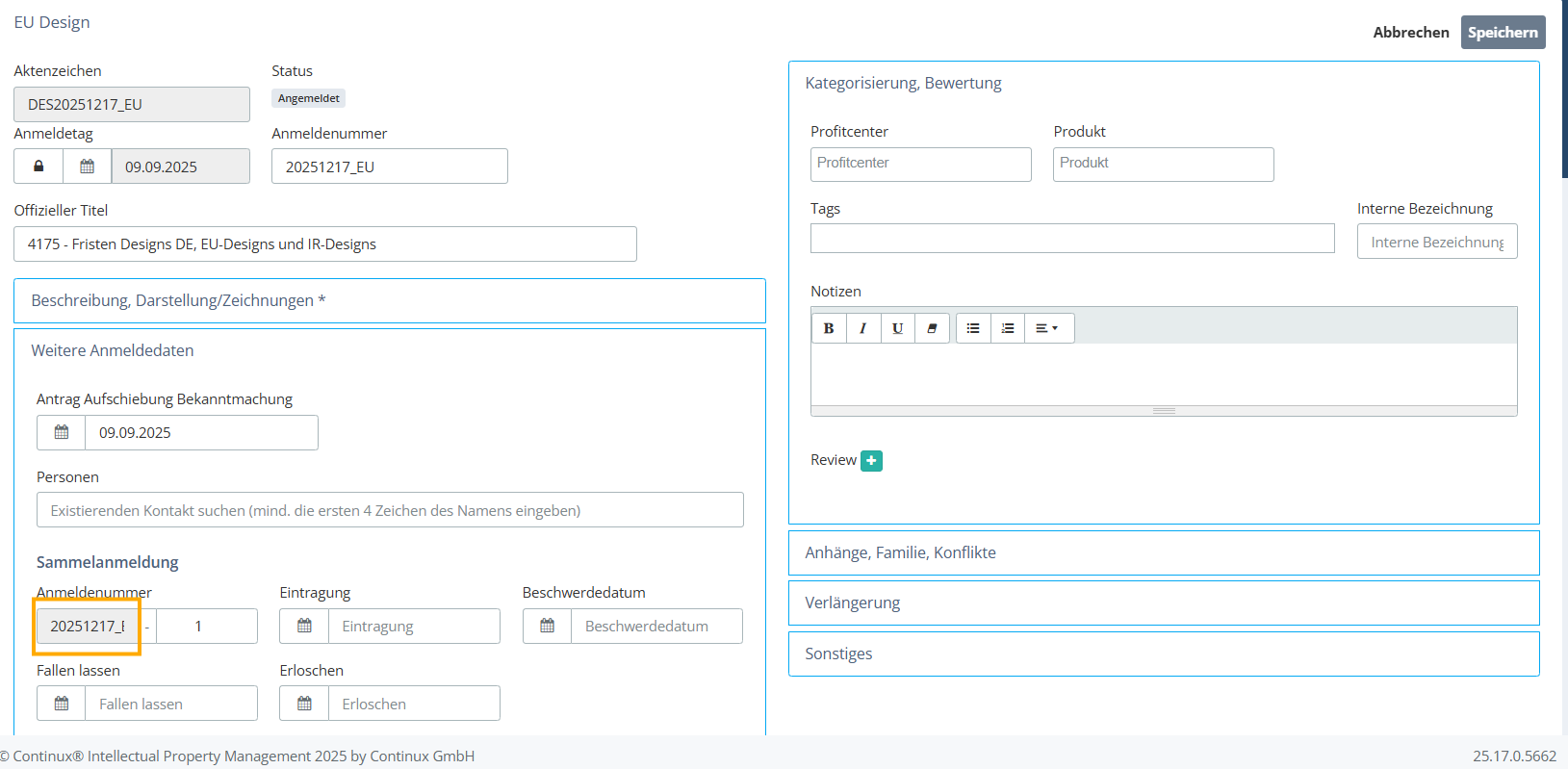 Bei deutschen Designs muss am Ende der Anmeldenummer (.x) Punkt und Ziffer bei der Übernahme des amtlichen Aktenzeichens in die Sammeldesigns abgeschnitten werden. Dabei soll die dargestellte Box für Anmeldenummer bei Sammelanmeldung so nach rechts verschoben werden, dass man bis zu 13 Ziffern noch erkennen kann.