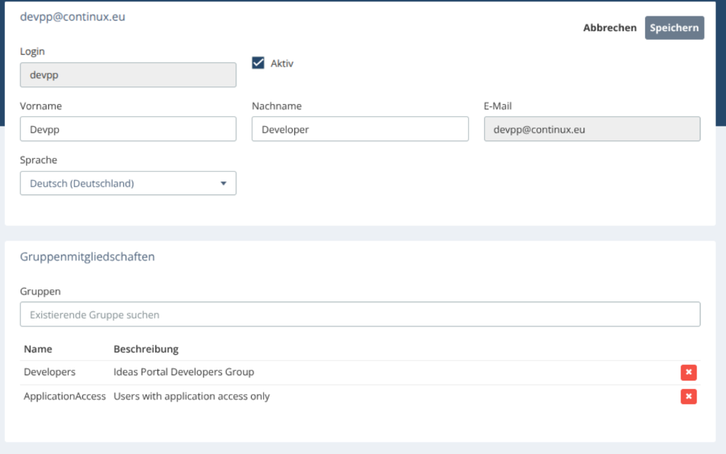 | Der Entwickler (Continux-Benutzer) muss zusätzlich zur Developer-Gruppe im Ideenportal Mitglied von mindestens einer Gruppe in Continux sein. Diese Gruppe kann einer Rolle ohne Berechtigungen angehören (vgl. Attorney Portal). | ||