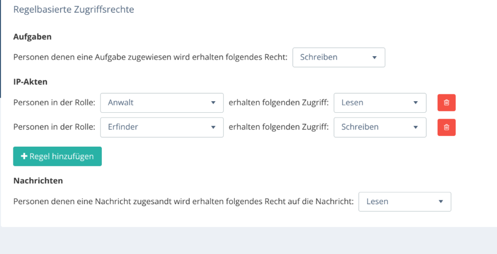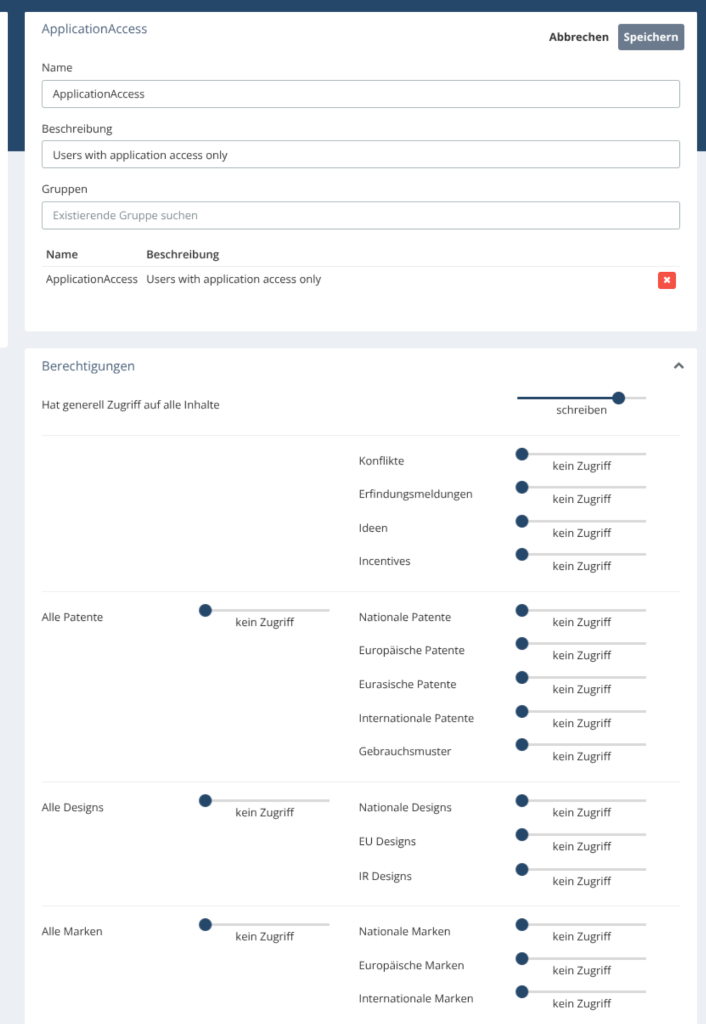 | In den Zugriffsregeln müssen sowohl für Erfinder als auch für zugewiesene Benutzer Lese- oder Schreibrechte festgelegt sein: | ||